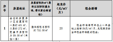 備注:1、租金不含物業管理費,需另外按每月2.8元/㎡/月收取,裝修免租期為3個月,免租期內需正常繳納物業管理費。2、中標人需同時簽訂物業服務合同及支付首季度物業費用,否則作廢標處理。3、房屋以現狀出租,涉及一切維修改造工程產生的費用均由承租人自行承擔。4、金世紀安置房小區空置面積673㎡(一層約401㎡、二層約272㎡)與江西金開正合實業有限公司簽訂房屋租賃合同,配套用房面積59.08㎡與南昌金開楓林物業管理有限公司簽訂房屋租賃合同,整體招租面積732.08㎡由南昌金開楓林物業管理有限公司一并簽訂物業服務合同;