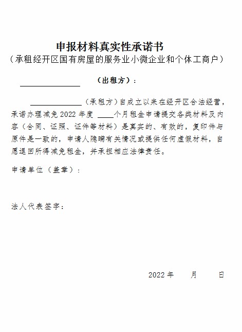 申報承租的服務業小微企業和個體工商戶向出租經營用房的國有企業(租賃合同的出租方)提出書面申請,根據洪府發【2022】15號文件精神,由金開集團按照市、區相關減免政策減免承租國有房屋租賃租金進行審核,對符合條件的承租戶給予減免。鼓勵對老承租戶實行“免申即享”新模式,通過梳理減租資產和承租戶清單,對于現有材料能夠證明其符合減租政策的承租戶,在履行相應決策程序后,直接予以減免。