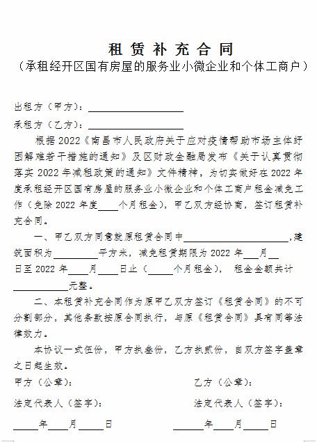 為認真貫徹《南昌市人民政府關于應對疫情幫助市場主體紓困解難若干措施的通知》(洪府發【2022】15號)文件精神,根據區財政金融局發布《關于認真貫徹落實2022年減租政策的通知》,結合經開區實際,落實承租經開區域內國有房屋的服務業小微企業和個體工商戶,2022年減免三個月租金,確保減免租金惠及最終承租人。現將實施細則通知如下: