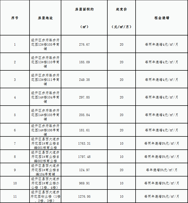 二、本次競拍采用有底價、有聲競拍的形式。競拍開始后,首次叫價為增幅后報價(13#樓3間;14#樓3間共計6間商鋪即不低于20.5元/平方米/月;1#商業樓2棟獨棟商業樓即不低于10.5元/平方米/月;1#商業樓自編104號商鋪即不低于20.5元/平方米/月;1#商業樓辦公樓即不低于10.5元/平方米/月;單獨一棟物業樓不低于10.5元/平方米/月),每次報價增幅最低不低于0.5元/平方米/月的整倍數,如出現競拍人僅舉牌不叫價情況,即默認為在上一輪叫價基礎上增加0.5元/平方米/月,否則應價無效。當最高價(超過底價)未有人追加競價時,主拍人對該價重復三次報價,第三次重復報價無人應價,由主拍人宣布成交。本次競拍取達到底價的最高報價人作為中標人,中標人若放棄中標人權力,不按排名順延中標人,我司將做廢標處理。