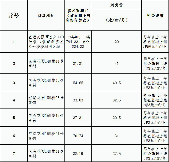 首次叫價為增幅后報價(即空港花園西主入口9號樓二樓南側(cè)房屋及一樓樓梯間區(qū)域不低于20.5元/㎡/月;空港花園14#樓44號商鋪不低于41.5元/㎡/月;空港花園14#樓45號商鋪不低于41元/㎡/月;空港花園15#樓06號商鋪不低于33元/㎡/月;空港花園15#樓12號商鋪不低于21元/㎡/月;空港花園15#樓21號商鋪不低于31.5元/㎡/月;空港花園14#樓41號商鋪不低于28元/㎡/月),每次報價增幅最低不低于0.5元/平方米/月的整倍數(shù),如出現(xiàn)競拍人僅舉牌不叫價情況,即默認為在上一輪叫價基礎(chǔ)上增加0.5元/平方米/月,否則應(yīng)價無效。當(dāng)最高價(超過底價)未有人追加競價時,主拍人對該價重復(fù)三次報價,第三次重復(fù)報價無人應(yīng)價,由主拍人宣布成交。本次競拍取達到底價的最高報價人作為中標(biāo)人,中標(biāo)人若放棄中標(biāo)人權(quán)力,不按排名順延中標(biāo)人,我司將做廢標(biāo)處理。