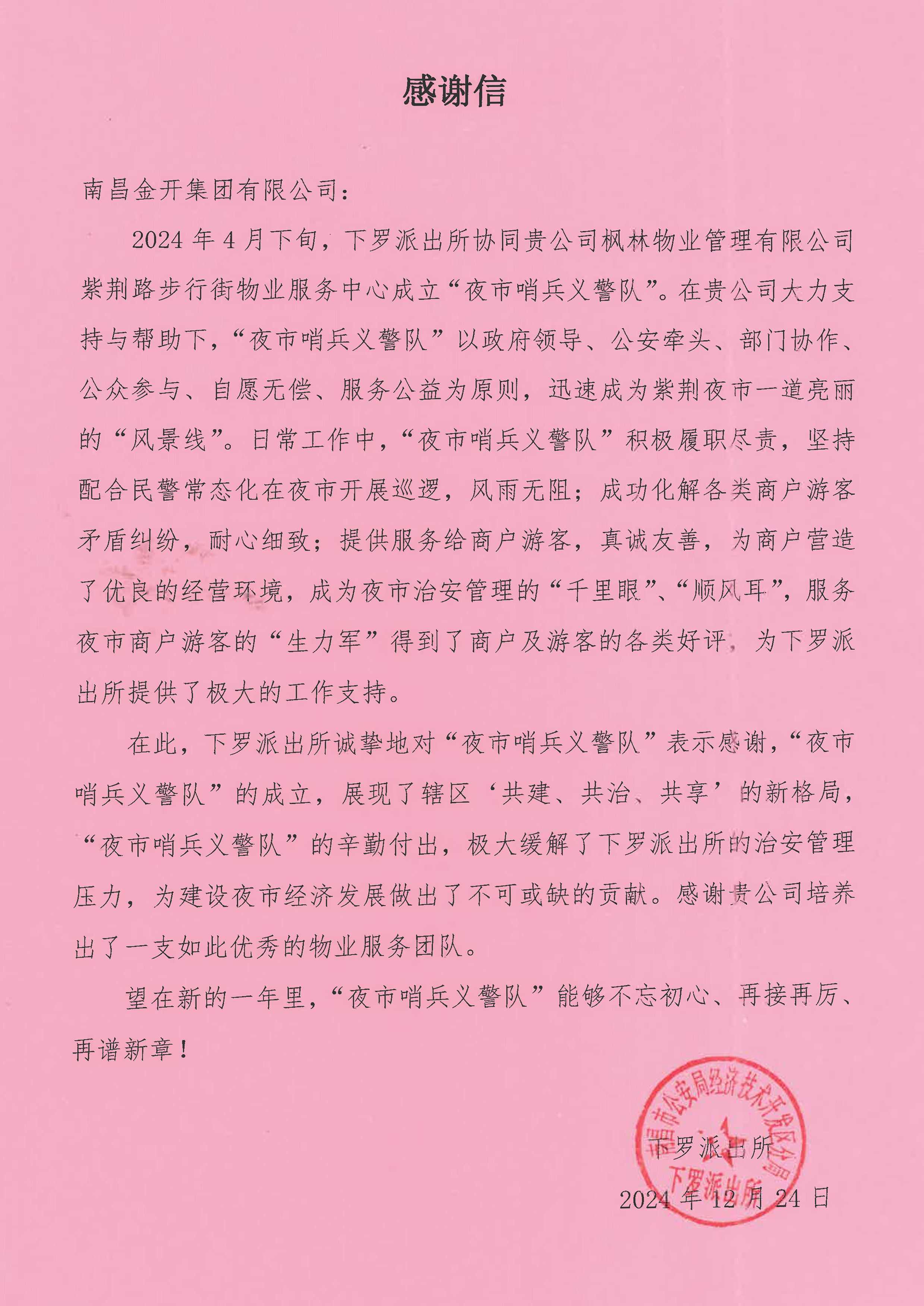 12月24日上午,南昌市公安局經濟技術開發區分局下羅派出所送來一封感謝信,對“夜市哨兵義警隊”在紫荊夜市治安管理中所付出的辛勤努力和取得的優異成績表示感謝與肯定。