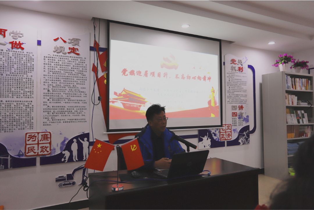 隨后,共建黨支部召開第一次會議。會上,雙方共同審議通過了共建黨支部黨員先鋒崗名單;并由袁扣華為大家?guī)砹艘惶弥黝}為“黨旗迎著項目飄 不忘初心向前沖”的黨課。